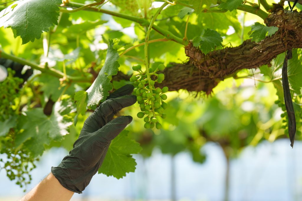 ぶどうは、逆三角形というか、円錐のような形が綺麗だとされてて、この作業をすることで、綺麗な形に育っていきます。逆にこの作業を怠ると、実が割れたり、糖度が上がらなかったりするんで。